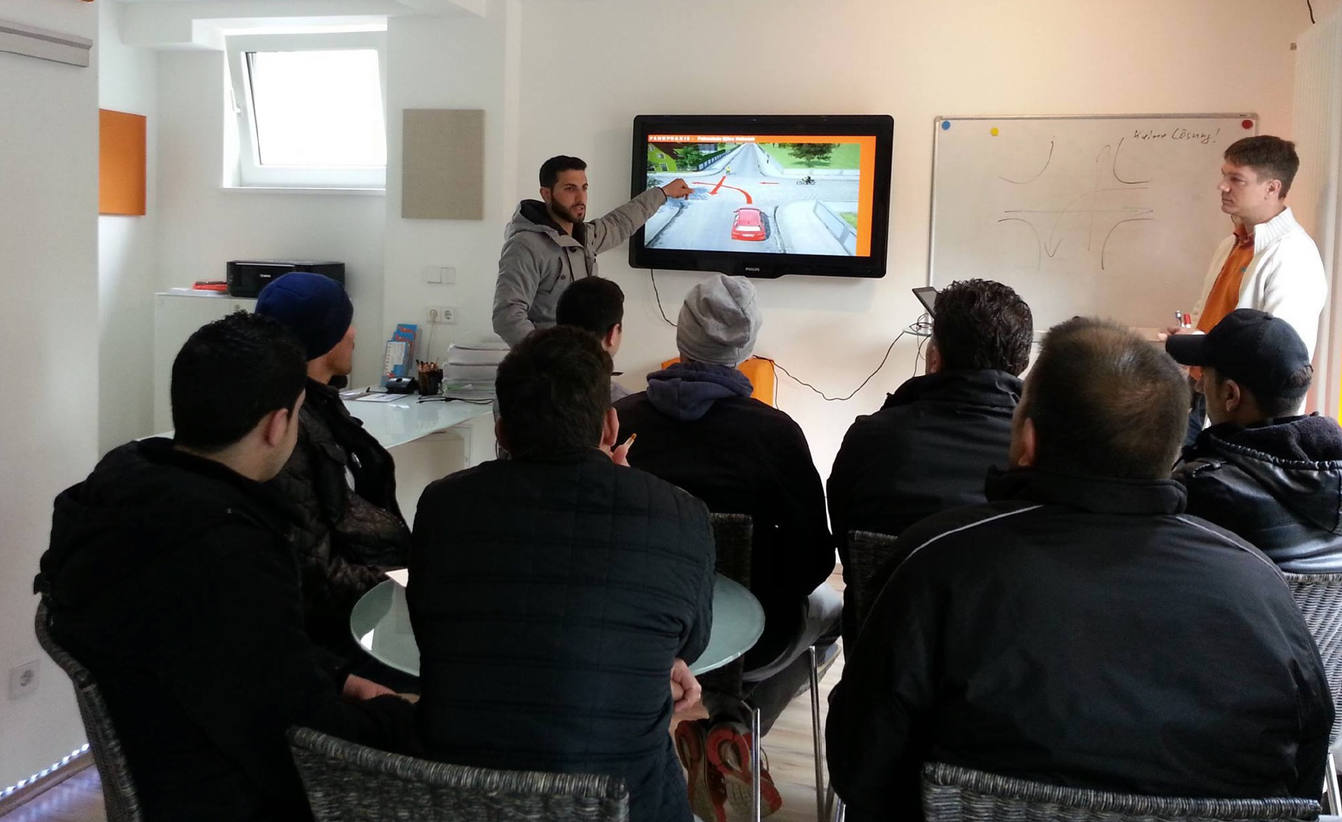 Zunächst wurden die bisher ausschließlich männlichen Teilnehmer in der örtlichen Fahrschule von Inhaber Björn Hellmich eineinhalb Stunden in die Theorie und Verkehrsregeln eingeführt. Als Übersetzer fungierte Idris Alhosin, ein junger Syrer, der selbst im August 2014 nach Deutschland kam. Danach ging es auf einen auf dem Festplatz im Freizeitpark aufgestellten Geschicklichkeitsparcours. Im Anschluss startete die Gruppe, alle ausgestattet mit neongelben Warnwesten, auf eine Fahrt durch die Gemeinde, um das Gelernte zu erproben. „Dabei hat man noch die ein oder andere Unsicherheit gesehen“, so der Organisator. In der Unterkunft habe es daher noch eine kurze Nachbesprechung gegeben. Zum Abschluss wurde an alle Teilnehmer ein Diplom verteilt.