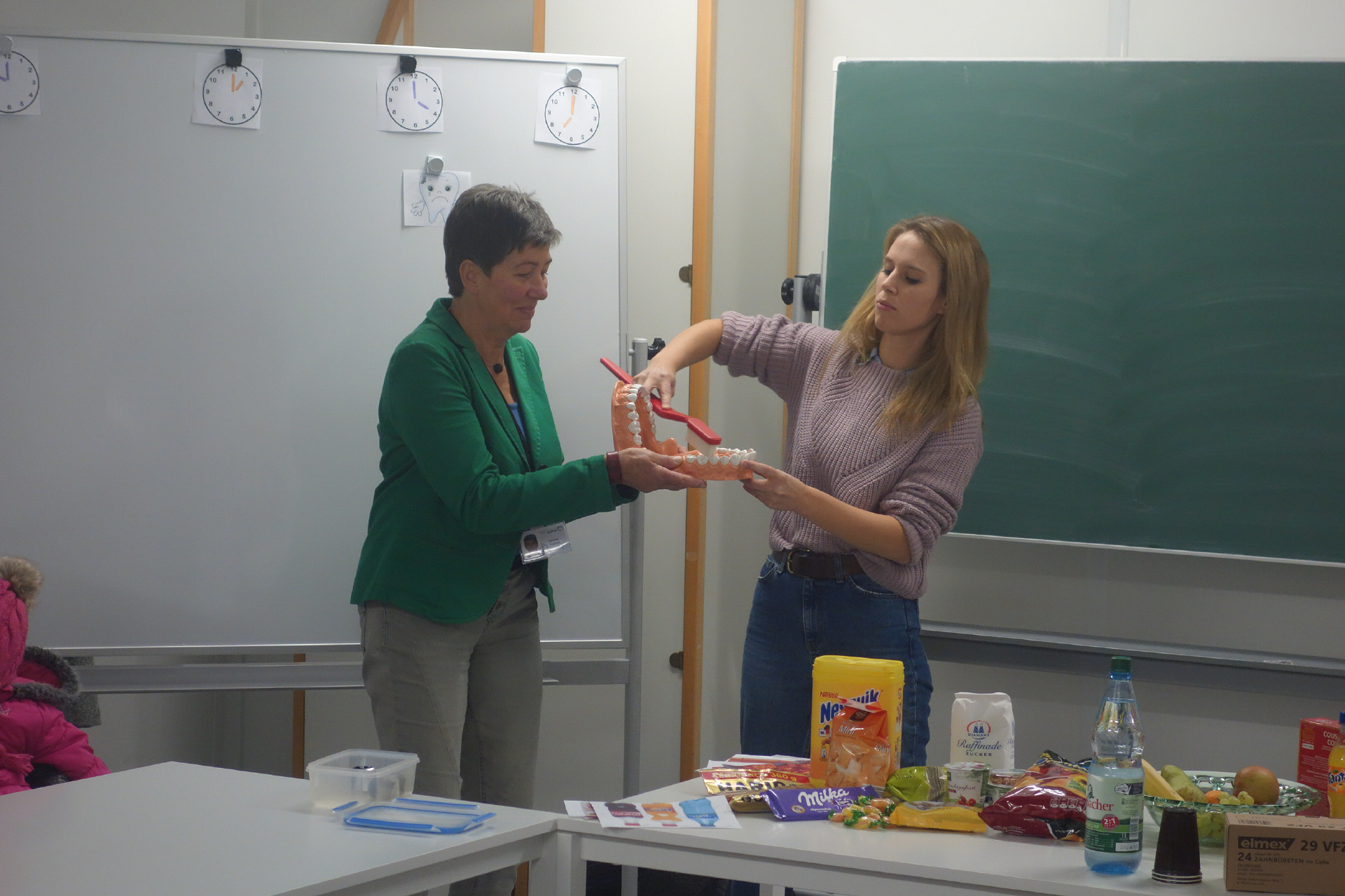 Frau Kissinger führte zunächst an einem Gebiss-Modell und mit einer riesigen Zahnbürste vor, wie Zähne zweimal täglich geputzt werden. Dies war sehr beeindruckend für die Kinder. Danach zeigte sie, welche Getränke und Lebensmittel Karies verursachen. Mit einem zwinkernden Auge muss gesagt werden, dass letztendlich Wasser und Karotten übrigblieben, was verständlicherweise bei unseren kleinen und großen Gästen zunächst zu langen Gesichtern führte.